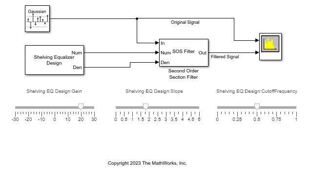 The Shelving Equalizer Design block designs a shelving equalizer with the specified gain, slope, and cutoff frequency. You can choose to design a low-shelf or a high-shelf equalizer. The block outputs the coefficients of a second-order section (SOS) filter, which you can use with the Second-Order Section Filter block to filter audio signals. You can tune the filter parameters during simulation.