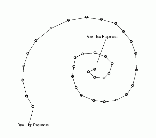 Converting sound into something the human brain can understand involves the inner, middle, and outer ear, hair cells, neurons, and the central nervous system. When a sound is made, the outer ear picks up acoustic waves, which are converted into mechanical vibrations by tiny bones in the middle ear. The vibrations move to the inner ear, where they travel through fluid in a snail-shaped structure called the cochlea. The fluid displaces different points along the basilar membrane of the cochlea. Displacements along the basilar membrane contain the frequency information of the acoustic signal. A schematic of the membrane is shown here (not drawn to scale).