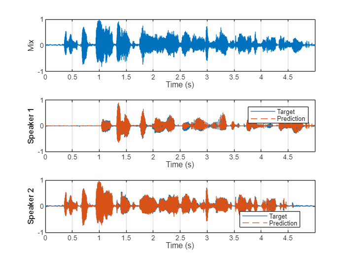 y = separateSpeakersConvTasNet(x,convtasNetFolder); plotSpeakerSeparation(t1,t2,x,y);