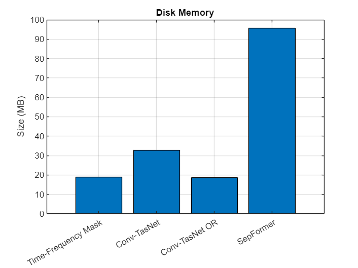 timefrequency_size = dir(fullfile(tfNetFolder,"CocktailPartyNet.mat")).bytes/1e6; convtasnet_size = dir(fullfile(convtasNetFolder,"paramsBest.mat")).bytes/1e6; convtasnet_or_size = dir(which("convtasnet-librimix-orpit.mat")).bytes/1e6; sepformer_size = dir(which("sepformer-libri2mix-upit.mat")).bytes/1e6; n = categorical(["Time-Frequency Mask","Conv-TasNet","Conv-TasNet OR","SepFormer"]); n = reordercats(n,["Time-Frequency Mask","Conv-TasNet","Conv-TasNet OR","SepFormer"]); figure bar(n,[timefrequency_size,convtasnet_size,convtasnet_or_size,sepformer_size]) grid on ylabel("Size (MB)") title("Disk Memory")