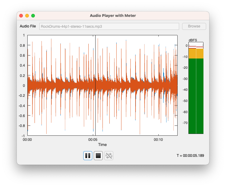 This example shows how to create an app to play and visualize audio files. The app plots any audio file and plays it using audiostreamer. While playing the audio, the app updates a playback cursor, a time status indicator, and a uiaudiometer component to perform sound level metering.