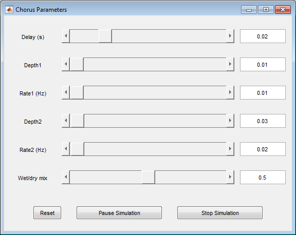 The chorus effect example has six tunable parameters that can be modified while the simulation is running: