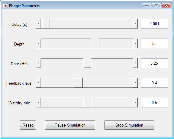 The flanger effect example has five tunable parameters that can be modified while the simulation is running: