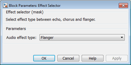 open_system('audiodelaybasedeffects')You can select the effect to be applied by double-clicking on the Effect Selector block.
