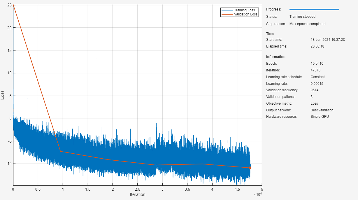 mbs = 6; options = trainingOptions("adam", ... Shuffle="every-epoch", ... Plots="training-progress", ... MaxEpochs=10, ... MiniBatchSize=mbs, ... TargetDataFormats="TCB", ... Verbose=false, ... GradientThreshold=5, ... InitialLearnRate=0.00015, ... OutputNetwork="best-validation", ... ExecutionEnvironment="gpu", ... ValidationData=mbqValidation, ... ValidationFrequency=2*round(numel(adsTrain.UnderlyingDatastores{1}.Files)/mbs), ... ValidationPatience=3);