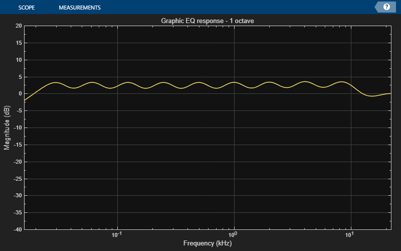 You can test the equalizer implemented in graphicEQ using Audio Test Bench. The audio test bench sets up the audio file reader and audio device writer objects, and streams the audio through the equalizer in a processing loop. It also assigns a slider to each gain value and labels the center frequency it corresponds to, so you can easily change the gain and hear its effect. Modifying the value of the slider simultaneously updates the magnitude response plot.