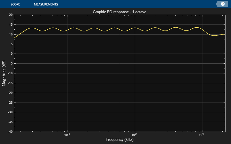 octaveGraphicEQ = graphicEQ; octaveGraphicEQ.Gains = [-2.1,-1.8,-1.4,2.7,4.2,4.6,3.1,-1,-1.8,-1.8,-1.4]; visualize(octaveGraphicEQ)