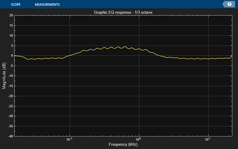 oneThirdOctaveGraphicEQ = graphicEQ; oneThirdOctaveGraphicEQ.Bandwidth = '1/3 octave'; oneThirdOctaveGraphicEQ.Gains = [-2,-1.9,-1.8,-1.6,-1.5,-1.4,0,1.2,2.7, ... 3.2,3.8,4.2,4.4,4.5,4.6,4,3.5,3.1,1.5,-0.1,-1,-1.2,-1.6,-1.8,-1.8, ... -1.8,-1.8,-1.7,-1.5,-1.4,-1.3]; visualize(oneThirdOctaveGraphicEQ)