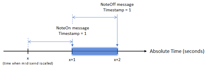 To send the Note Off message separately, specify the timestamp of the Note Off message relative to the largest timestamp of the previous call to