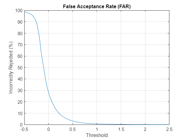 The speaker false acceptance rate (FAR) is the rate that utterances not belonging to an enrolled speaker are incorrectly accepted as belonging to the enrolled speaker. Use the known speaker set to determine the speaker FAR for a set of thresholds. Use the same set of thresholds used to determine FRR.