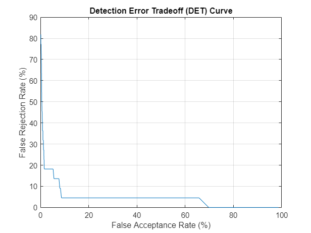 x1 = FAR*100; y1 = FRR*100; plot(x1,y1) grid on xlabel("False Acceptance Rate (%)") ylabel("False Rejection Rate (%)") title("Detection Error Tradeoff (DET) Curve")
