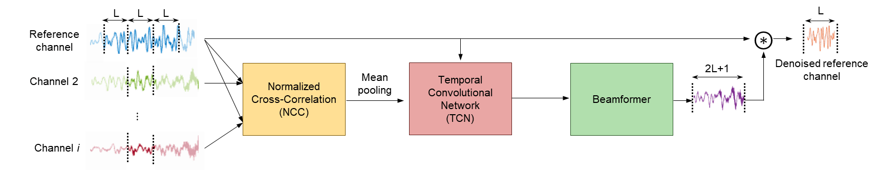 In stage two, a NCC metric is computed between the denoised windows of the reference channel and windows of the remaining channels with context. A beamforming filter is learned for each of the remaining channels. Each channel is separately denoised, and then the channels are summed to create the beamformed final signal.