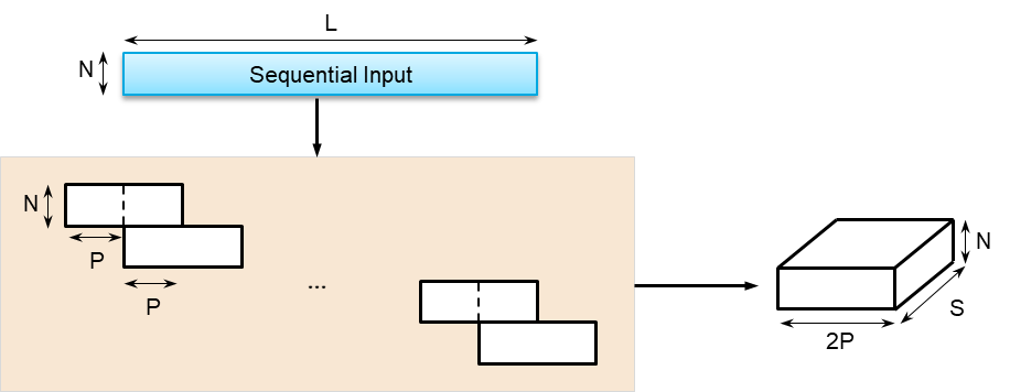 The sequence is split into S segments of length K with overlap P. In this example, K = 2P.