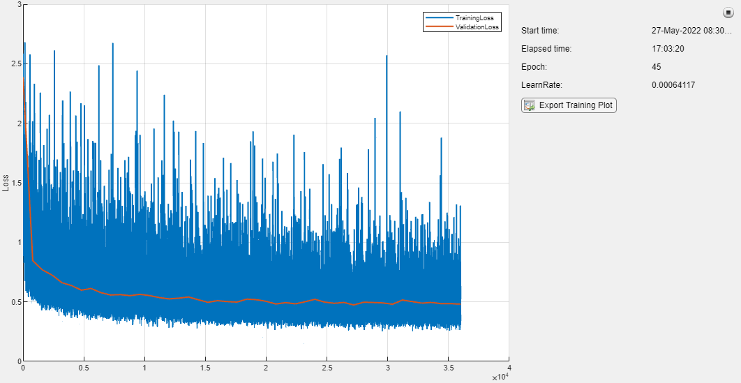 for epoch = 1:maxEpochs % Update plot info updateInfo(monitor,Epoch=epoch,LearnRate=learnRate) % Shuffle dataset each epoch shuffle(mbqTrain) while hasdata(mbqTrain) iteration = iteration + 1; % Get next mini batch [X,T] = next(mbqTrain); % Pass the predictors through the network and return the loss and % gradients. [loss,gradients] = dlfeval(@modelLoss,learnables,parameters,X,T,lossType); % Update the network parameters using the ADAM optimizer. [learnables,averageGrad,averageSqGrad] = adamupdate(learnables,gradients, ... averageGrad,averageSqGrad,iteration,learnRate); % Update training progress visualization loss = gather(extractdata(loss)); recordMetrics(monitor,iteration,TrainingLoss=loss) if monitor.Stop break end end if monitor.Stop break end % Compute validation loss validationLoss = mbqLoss(mbqValidation,learnables,parameters,lossType); % Update validation progress visualization recordMetrics(monitor,iteration,ValidationLoss=validationLoss) % Checkpoint if validationLoss < bestLoss bestLoss = validationLoss; bestLossEpoch = epoch; save("CheckPoint.mat","bestLoss","learnables","epoch", ... "averageGrad","averageSqGrad","iteration","learnRate") end if (epoch - bestLossEpoch) > validationPatience display("Validation loss did not improve for "+validationPatience+" epochs.") break end % Reduce the learning rate according to schedule if rem(epoch,learnRateDropPeriod)==0 learnRate = learnRate*learnRateDropFactor; end end