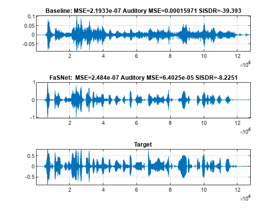 tiledlayout(3,1) nexttile plot(yBaseline) title("Baseline:"+" MSE="+yBaselineMSE+" Auditory MSE="+yBaselineAMSE+" SISDR="+yBaselineSISDR) grid on axis tight nexttile plot(y) title("FaSNet: "+" MSE="+yMSE+" Auditory MSE="+yAMSE+" SISDR="+ySISDR) grid on axis tight nexttile plot(target) grid on title("Target") axis tight