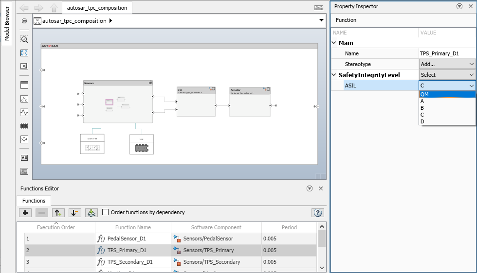 openExample("autosar_tpc_composition")Import an ASIL profile from the architecture toolstrip. On the Modeling tab select Profile Editor > Import Profile > ASIL Profile.
