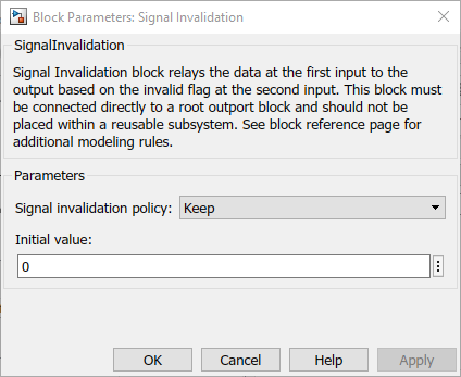 View the Signal Invalidation block parameters dialog box. Examine the Signal invalidation policy and Initial value attributes. For more information, see the Signal Invalidation block reference page.