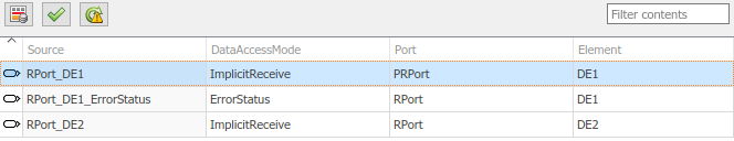 PRPort. In this example, theRPort_DE1inport andPPort_DE1outport both use data typeint8, port dimension 1, and signal typereal.Open the AUTOSAR Dictionary and navigate to the SenderReceiverPorts view. (To configure a