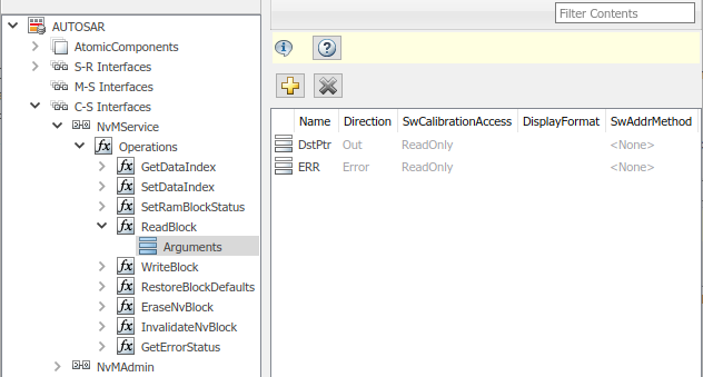 NvMService, and underNvMService, its supported operations. For each operation, arguments are provided with read-only properties. Here are the arguments for theNvMServiceoperationReadBlockdisplayed in the AUTOSAR Dictionary.