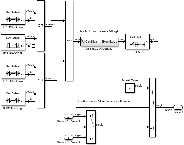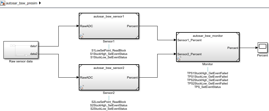 Here is a throttle position integration model, which integrates two throttle position sensor components and a throttle position monitor component. The sensor components take a raw throttle position sensor (TPS) value and convert it to a TPS percent value. The monitor component takes the TPS percent values provided by the primary and secondary sensor components and decides which TPS signal to pass through. The sensor components call BSW NvM and Dem services, and the monitor component calls BSW Dem services.