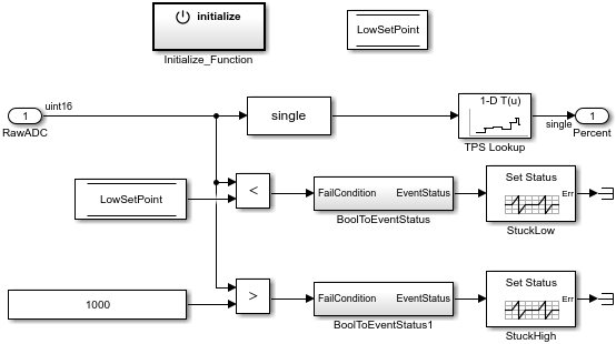 Here is the DiagnosticinfoCaller block dialog box for the TPS1StuckLow call. For more information, see DiagnosticInfoCaller.