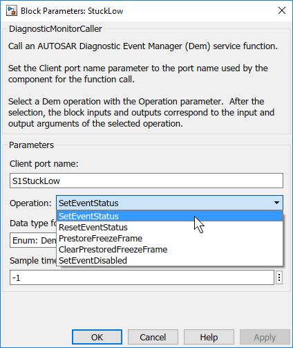 In your AUTOSAR software component model, to implement client calls to NvM, Dem, and FiM service interfaces, you drag and drop preconfigured NvM, Dem, and FiM caller blocks. Each block has prepopulated parameters, such as Client port name and Operation. You configure the block parameters, for example, to select a service operation to call. To configure the added caller blocks in the AUTOSAR software component, you synchronize the model. The software creates AUTOSAR client-service interfaces, operations, and ports, and maps each Simulink function call to an AUTOSAR client port and operation. For more information, see Configure Calls to AUTOSAR NVRAM Manager Service, Configure Calls to AUTOSAR Diagnostic Event Manager Service, and Configure Calls to AUTOSAR Function Inhibition Manager Service.