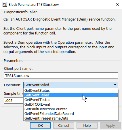 DiagnosticInfocalls are implemented using the Basic Software library block DiagnosticInfoCaller. Each block is configured to call theDiagnosticInfooperationGetEventFailed. TheGetEventFailedcalls use client portsTPS1StuckLow,TPS1StuckHigh,TPS2StuckLow, andTPS2StuckHigh.