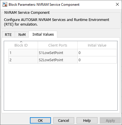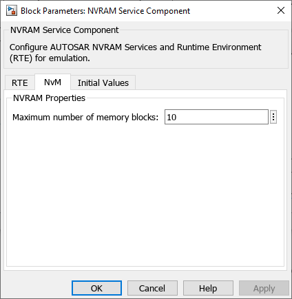 The NVRAM Service Component block has prepopulated parameters, including run-time environment (RTE) parameters and NVRAM Properties parameters. Examine the parameter settings and consider if any require modifying, based on how you are using the NvM service operations. For more information, see NVRAM Service Component.