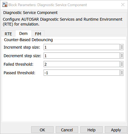 The Diagnostic Service Component block has prepopulated parameters, including RTE parameters and Dem Counter-Based Debouncing parameters. Examine the parameter settings and consider if any require modifying, based on how you are using the Dem service operations.