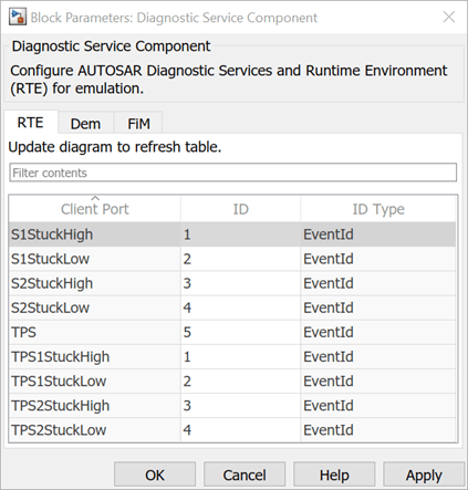 The RTE tab table lists component client ports and their mapping to Dem or FiM service IDs (in this example, event IDs). Each row in the table represents a call into Dem services from a Basic Software caller block. Calls that act on the same event typically use the same event ID. This example maps the Dem SetEventStatus client ports to different event IDs, and then maps the Dem GetEventFailed client ports to event IDs that are shared with SetEventStatus ports. For example, SetEventStatus port S1StuckHigh and GetFailedEvent port TPS1StuckHigh share event ID 1; S1Stucklow and TPS1StuckLow share event ID 2; and so on.