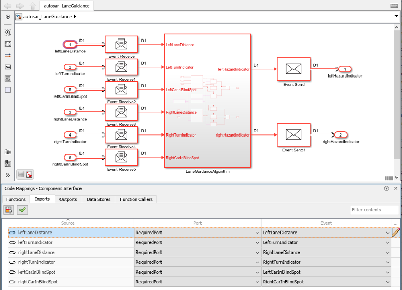In the AUTOSAR code perspective, examine the mapping of Simulink inports and outports to AUTOSAR required and provided ports and events.