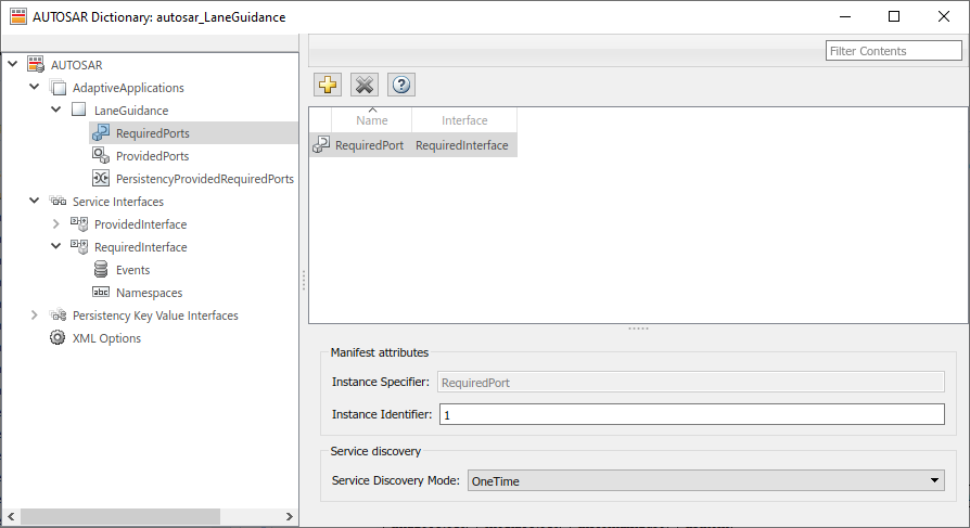 In the AUTOSAR Dictionary, examine the AUTOSAR properties for RequiredPorts, ProvidedPorts, and Service Interfaces.
