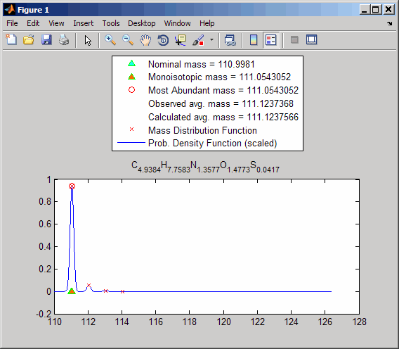 isotopicdist([4.9384 7.7583 1.3577 1.4773 0.0417])