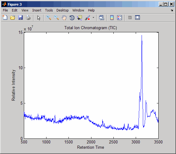 figure [MZ,Y] = msppresample(ms_peaks,5000); plot(ret_time,sum(Y)) title('Total Ion Chromatogram (TIC)') xlabel('Retention Time') ylabel('Relative Intensity')