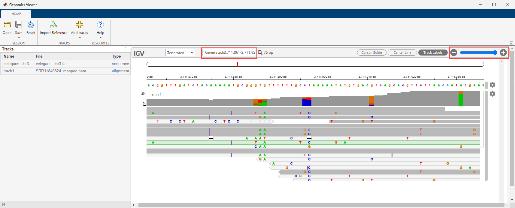 gv = genomicsViewer(ReferenceFile="celegans_chr3.fa",CytoBand="celegans_cytoBandIdeo.txt.gz"); addTracks(gv,"SRR11846824_mapped.bam");