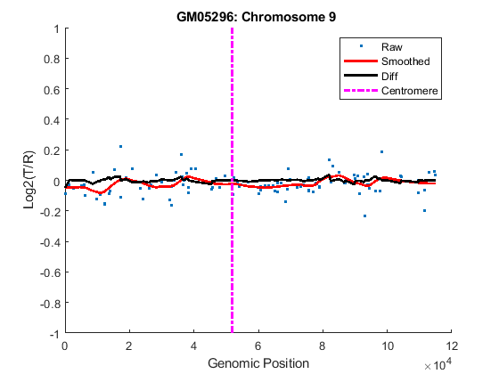The array-based CGH data can be quite noisy. Therefore, accurate identification of chromosome regions of equal copy number that accounts for the noise in the data requires robust computational methods. In the rest of this example, you will work with the data of chromosomes 9, 10 and 11 of the GM05296 cell line.