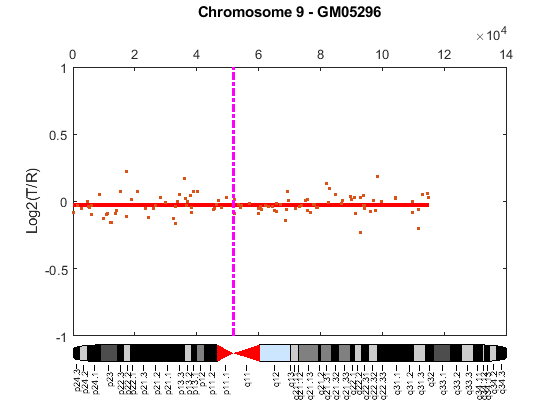 As shown in the plots, no copy number alterations were found on chromosome 9, there is copy number gain span from 10q21 to 10q24, and a copy number loss region from 11p12 to 11p13. The CNAs found match the known results in cell line GM05296 determined by cytogenetic analysis.