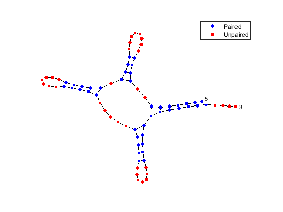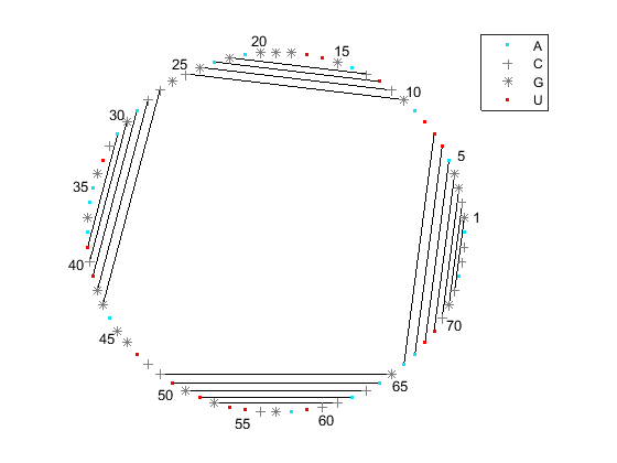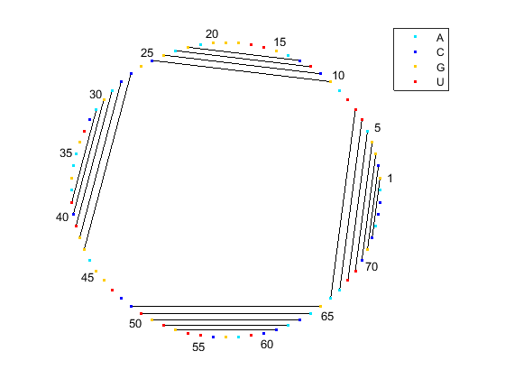 [ha, H] = rnaplot(phe_str, 'sequence', phe_seq, 'format', 'circle', ... 'colorby', 'state'); H.Unpaired.Visible = 'off'; legend off;