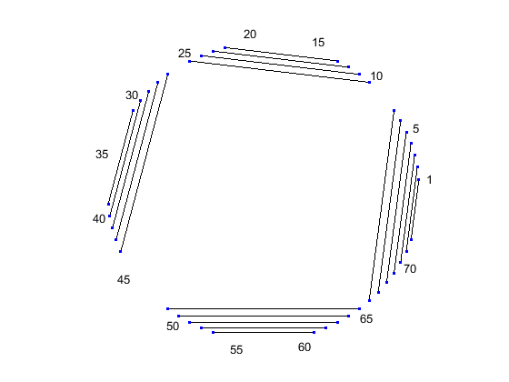 Similar observations can be drawn by displaying the secondary structure as a circle, where each base is represented by a dot on the circumference of a circle of arbitrary size, and bases that pair with each other are connected by lines. The lines are visually clustered into four distinct groups, separated by stretched of unpaired residues. We can hide the unpaired residues by using H.Unpaired, the handle returned with the colorby property set to state.