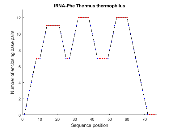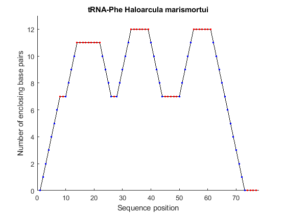 yeast = 'GCGGACUUAGCUCAGUUGGGAGAGCGCCAGACUGAAGAUCUGGAGGUCCUGUGUUCGAUCCACAGAGUUCGCACCA'; halma = 'GCCGCCUUAGCUCAGACUGGGAGAGCACUCGACUGAAGAUCGAGCUGUCCCCGGUUCAAAUCCGGGAGGCGGCACCA'; theth = 'GCCGAGGUAGCUCAGUUGGUAGAGCAUGCGACUGAAAAUCGCAGUGUCGGCGGUUCGAUUCCGCCCCUCGGCACCA'; yeast_str = rnafold(yeast); theth_str = rnafold(theth); halma_str = rnafold(halma); h1 = rnaplot(yeast_str, 'sequence', yeast, 'format', 'mountain'); title(h1, 'tRNA-Phe Saccharomyces cerevisiae'); legend hide; h2 = rnaplot(halma_str, 'sequence', halma, 'format', 'mountain'); title(h2, 'tRNA-Phe Haloarcula marismortui'); legend hide; h3 = rnaplot(theth_str, 'sequence', theth, 'format', 'mountain'); title(h3, 'tRNA-Phe Thermus thermophilus'); legend hide;