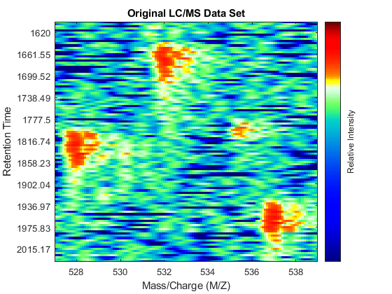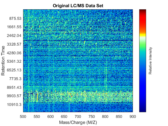 This example shows how to manipulate, preprocess and visualize data from Liquid Chromatography coupled with Mass Spectrometry (LC/MS). These large and high dimensional data sets are extensively utilized in proteomics and metabolomics research. Visualizing complex peptide or metabolite mixtures provides an intuitive method to evaluate the sample quality. In addition, methodical correction and preprocessing can lead to automated high throughput analysis of samples allowing accurate identification of significant metabolites and specific peptide features in a biological sample.