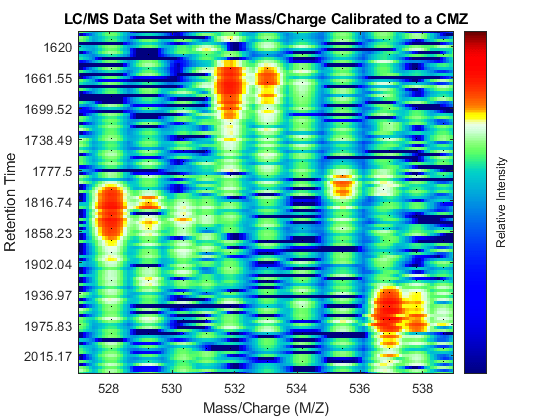 [MZ_A,Y_A] = msppresample(peaks_CMZ,5000); fh2 = msheatmap(MZ_A,time,log(Y_A),'resolution',.10,'range',[500 900]); title('LC/MS Data Set with the Mass/Charge Calibrated to a CMZ') dp2 = msdotplot(peaks_CMZ,time); axis([527 539 385 496])