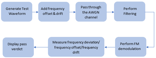 helperModulationTestFilterDesign— Design channel filterhelperBRModulationTestMeasurements— Measure frequency deviation, carrier frequency offset and drifthelperModulationCharacteristicsTest— Perform modulation characteristics testhelperBRModulationTestVerdict— Validate test measurement values and displays the result