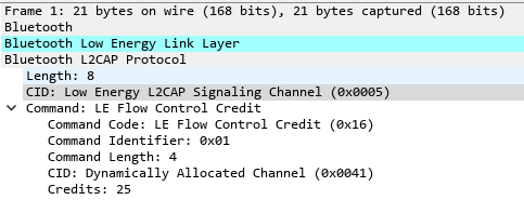 % Command type cfgL2CAP.CommandType = 'Flow control credit'; % Source channel identifier cfgL2CAP.SourceChannelIdentifier = '0041'; % LE credits cfgL2CAP.Credits = 25