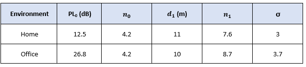 The National Institute of Standards and Technology (NIST) [4] conducted studies for indoor to indoor, outdoor to outdoor, and outdoor to indoor propagation paths and derived these equations for calculating the path loss: