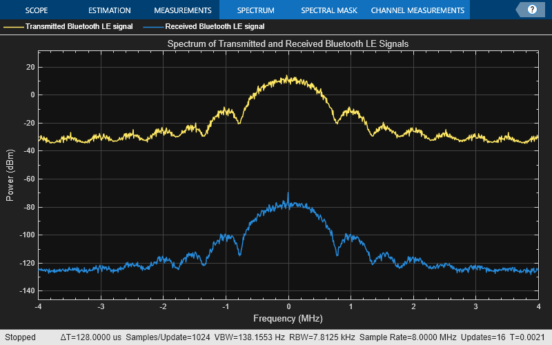 % Plot the spectrum of the transmitted and received Bluetooth LE waveform specAnalyzer = spectrumAnalyzer('SampleRate',symbolRate*sps, ... 'Title','Spectrum of Transmitted and Received Bluetooth LE Signals', ... 'ShowLegend',true, ... 'ChannelNames',{'Transmitted Bluetooth LE signal','Received Bluetooth LE signal'}); specAnalyzer(txWaveform,rxWaveform); release(specAnalyzer);