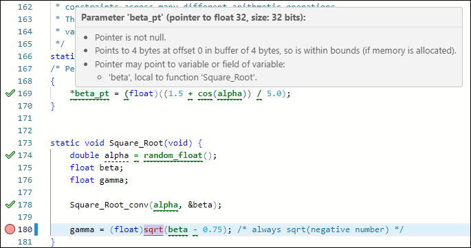 If Code Prover cannot prove the absence of an error or presence of a definite error, it highlights the operation in orange. This small percentage of orange checks indicate operations that you must review carefully, through visual inspection or testing. The orange checks often indicate hidden vulnerabilities. For instance, the operation might be safe in the current context but fail when reused in another context.