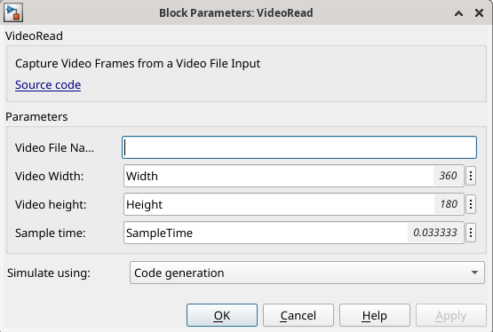The VideoRead block takes a video file as input and outputs each frame of the video along with the corresponding time-stamp. Double-click the block to set the File Name, Width and Height of each frame.