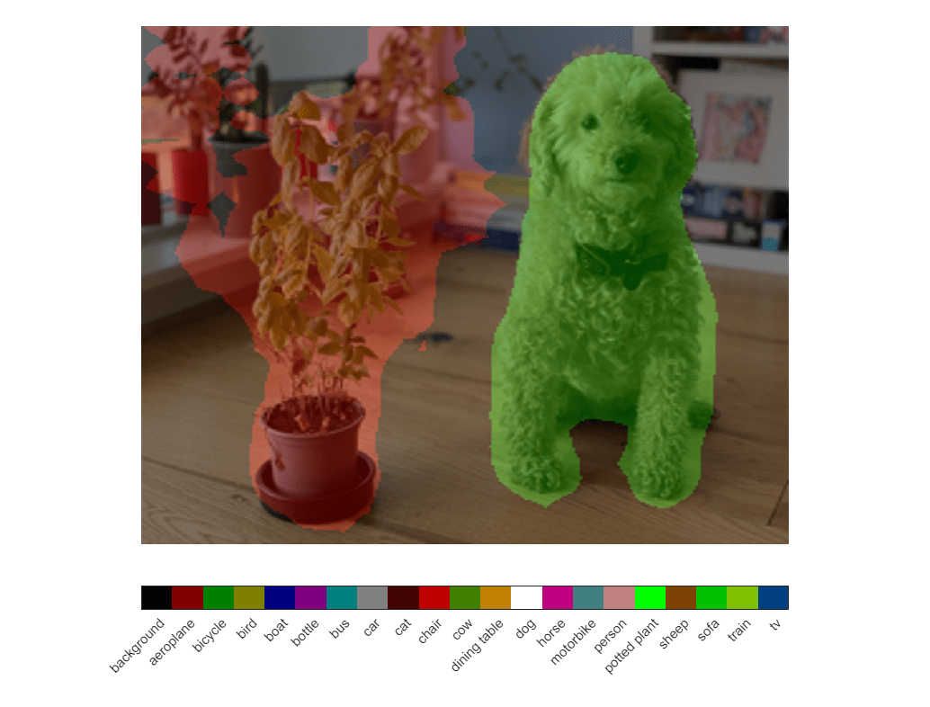 This example shows how to simulate and generate code for an image segmentation application that uses a Tensorflow Lite (TFLite) model. This example uses DeepLab V3 TensorFlow Lite model from the TensorFlow™ hub. This model can segment each pixel of the input image into 21 classes, such as background, dog, and plant.