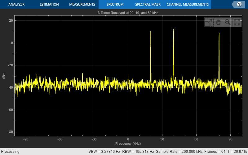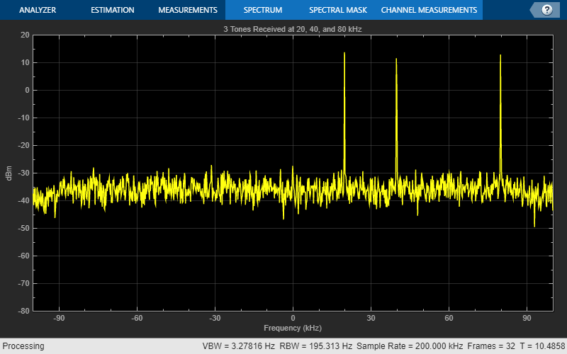 % Capture 10 frames, but only use the last frame to skip the transient % effects due to changing FrequencyCorrection disp(['Capture signal and verify frequency correction' newline]) for i = 1:10 receivedSig = rx(); end % Find the tone that corresponds to the 80 kHz transmitted tone % fReceived2 should be very close to 80 kHz y = fftshift(abs(fft(receivedSig))); [~,idx] = findpeaks(y,'MinPeakProminence',max(0.5*y)); fReceived2 = (max(idx)-numSamples/2-1)/numSamples*sampleRate; % Plot the spectrum sa.Title = '3 Tones Received at 20, 40, and 80 kHz'; receivedSig = reshape(receivedSig, [], 16); % Reshape into 16 columns for i = 1:size(receivedSig, 2) sa(receivedSig(:,i)); end msg = sprintf('Tone detected at %.3f kHz\n', fReceived2/1000); disp(msg);